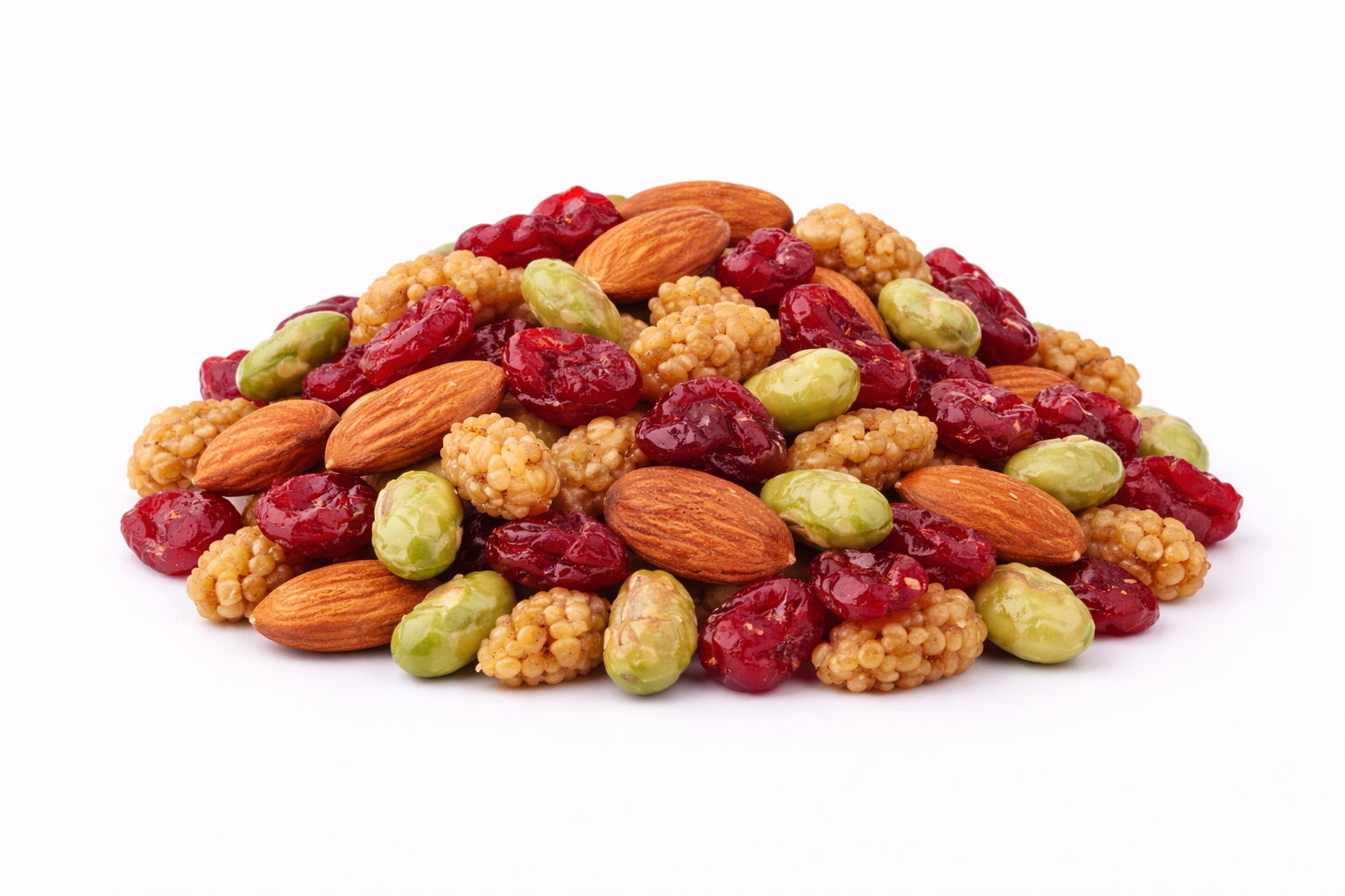 - Mit Mandeln (25 %), Maulbeeren (25 %), Cranberries (25 %) und gerösteten Edamame-Bohnen (25 %)